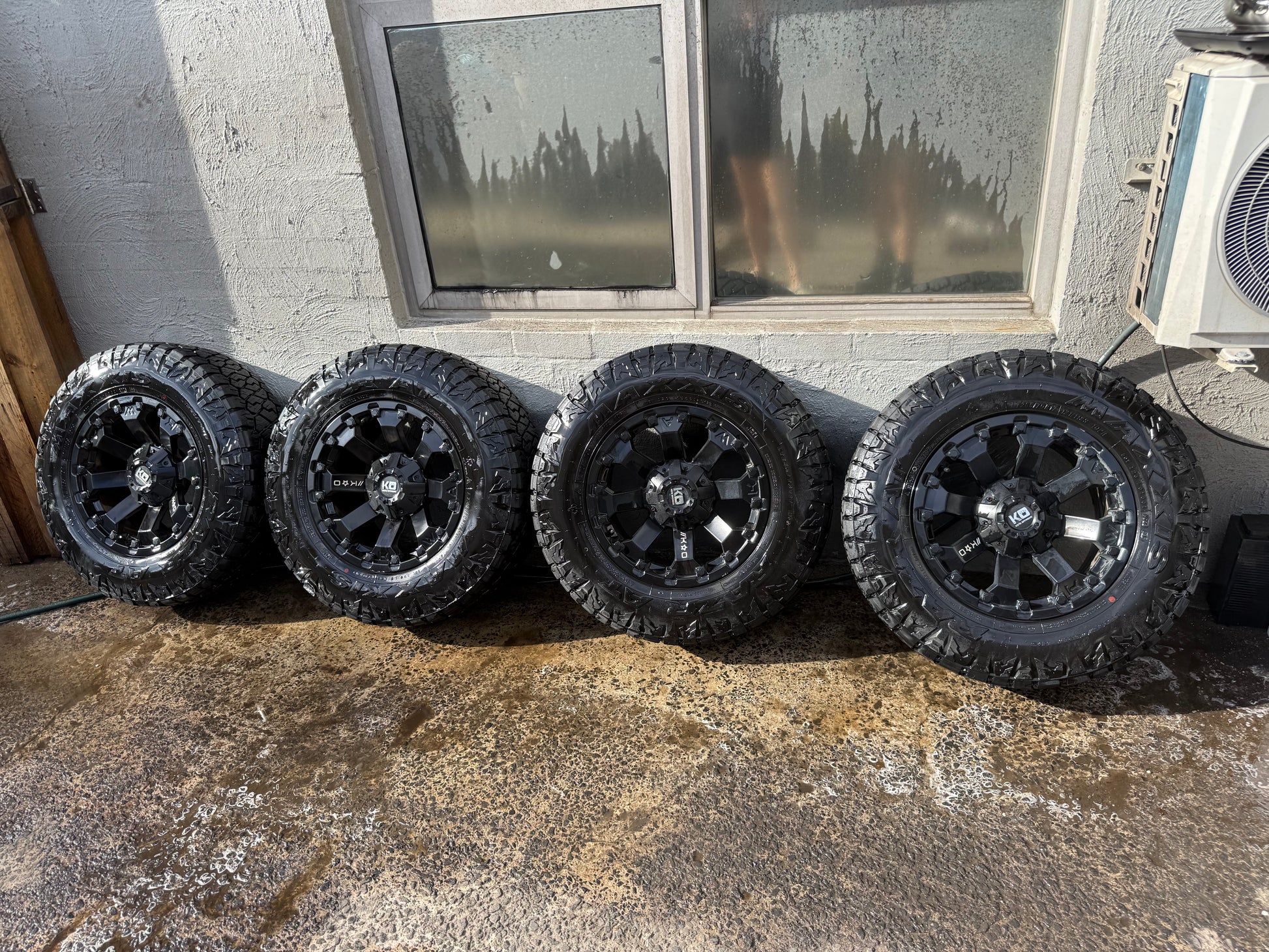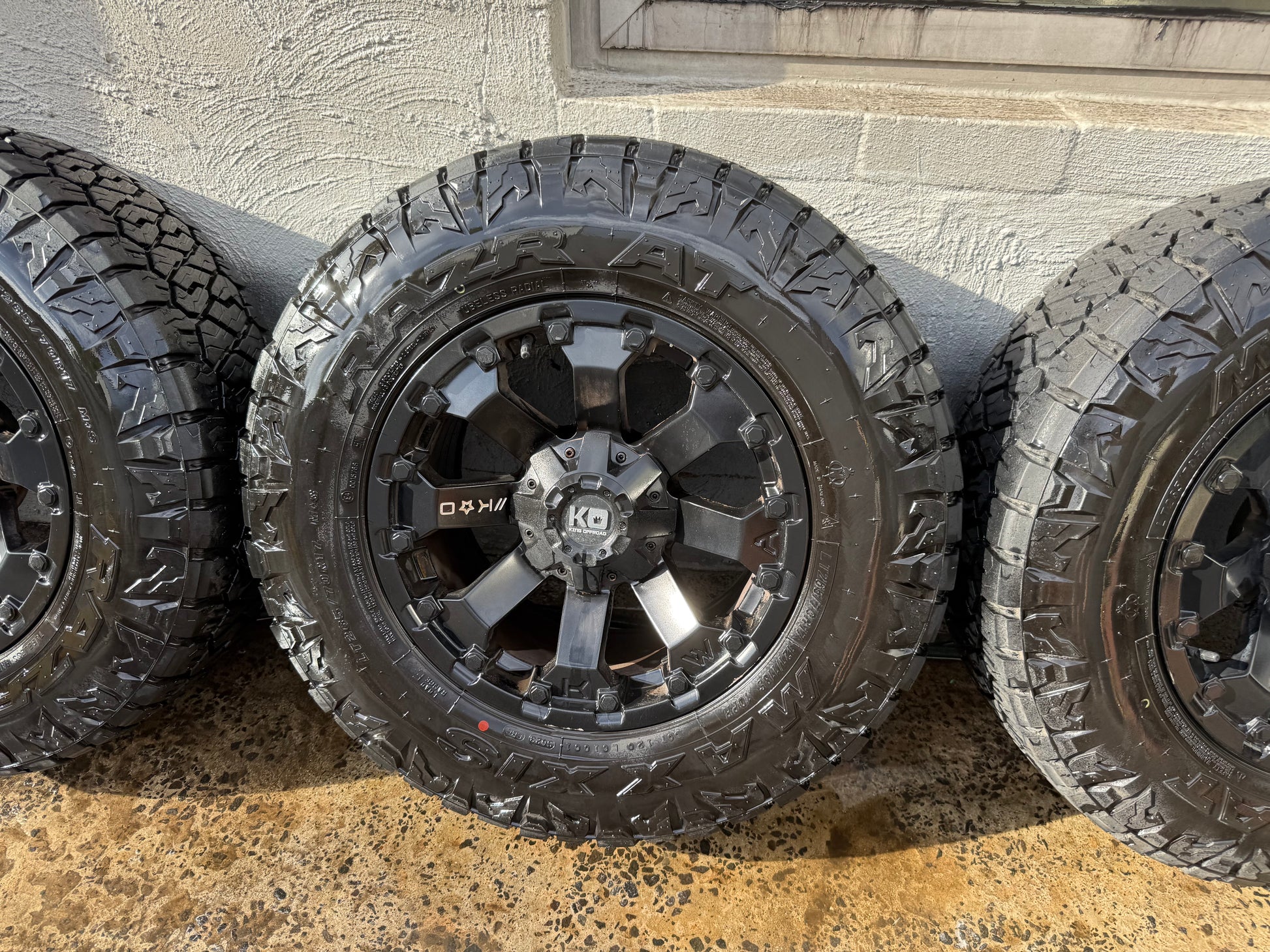 King Off Road Black Alloy Wheels with Maxxis Razr A/T Tyres. No cracks, buckles or flat spots. Tyres have 90% tread. 265/70R17 tyre size. 17x9. ET0. Stud pattern 6x139.7. Have been balanced and are ready to go straight on. Pickup from Highett or delivery is available for an extra cost, anywhere in Australia. Call or text anytime. Will not sell individually. Sold as a set only.